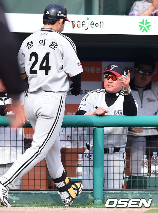 20일 오후 대전구장에서 열린 '2014 한국야쿠르트 세븐 프로야구' 한화 이글스와 LG 트윈스의 경기, 6회초 1사 LG 정의윤이 솔로홈런을 날린후 김기태 감독과 하이파이브를 하고 있다.