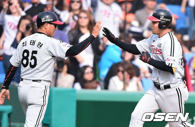 20일 오후 대전구장에서 열린 '2014 한국야쿠르트 세븐 프로야구' 한화 이글스와 LG 트윈스의 경기, 6회초 1사 LG 정의윤이 솔로홈런을 날린후 최태원 코치와 하이파이브를 하고 있다.