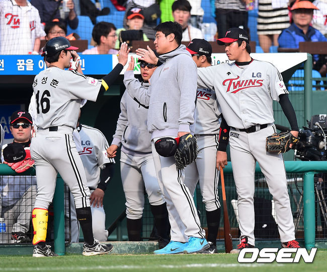 20일 오후 대전구장에서 열린 '2014 한국야쿠르트 세븐 프로야구' 한화 이글스와 LG 트윈스의 경기, 7회초 2사 1루 LG 정성훈이 2점 홈런을 날리고 동료들의 축하를 받고 있다.