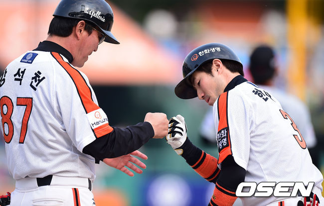 20일 오후 대전구장에서 열린 '2014 한국야쿠르트 세븐 프로야구' 한화 이글스와 LG 트윈스의 경기, 7회초말 1사 2루 한화 한상훈이 1타점 적시타를 날린후 강석천 코치와 하이파이브를 하고 있다