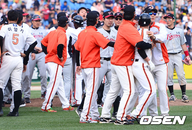 20일 오후 대전구장에서 열린 '2014 한국야쿠르트 세븐 프로야구' 한화 이글스와 LG 트윈스의 경기, 8회 한화 정근우가 LG 정찬헌의 공에 맞은 후 벤치클리어링이 발생하고 있다.
