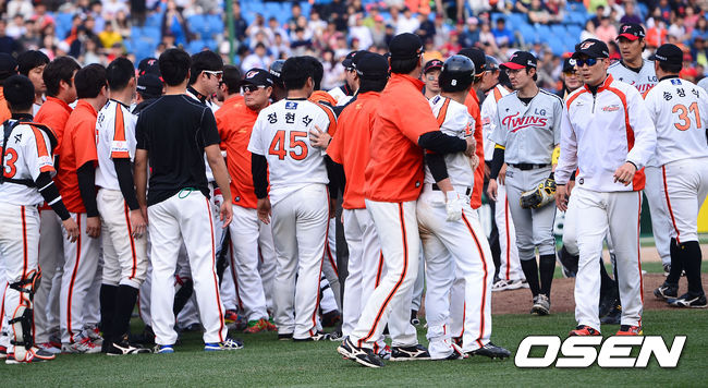 8회말 한화 정근우가 LG 정찬헌의 투구에 맞은 후 벤치클리어링이 발생되고 있다. /soul1014@osen.co.kr