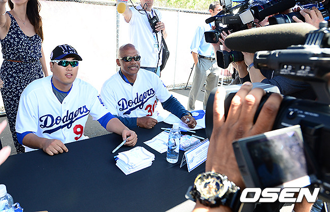 취재진에 포토타임 갖는 류현진, 한국 뿐 아니라 현지 취재진에도 많은 관심을 받으며 사인회가 진행됐다.