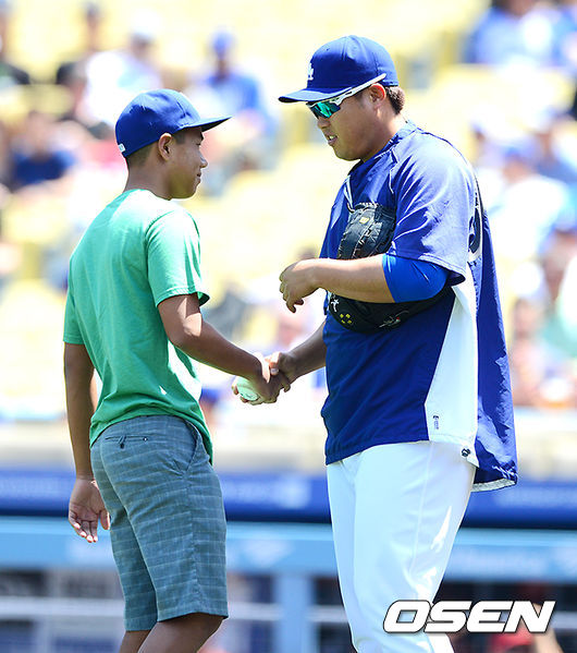 경기에 앞서 류현진이 포구자로 나서 자선 사인회에서 시구자로 선정된 팬과 인사를 나누고 있다.