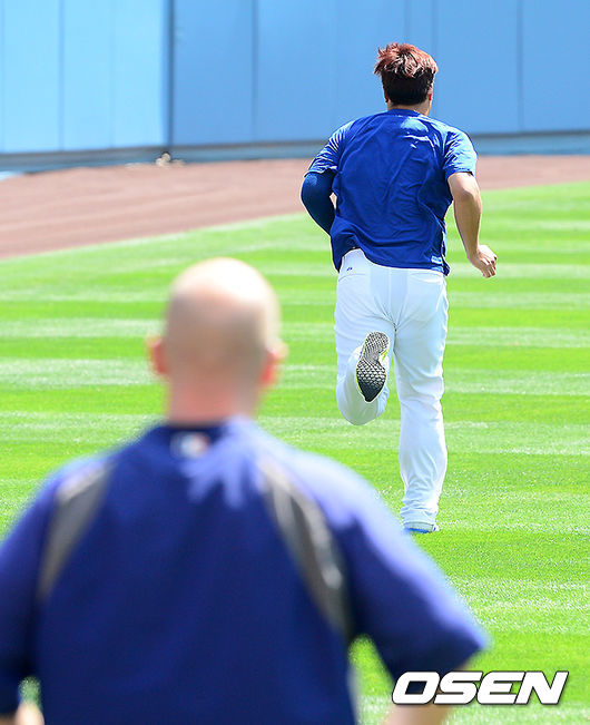경기에 앞서 류현진이 트레이너가 지켜보는 가운데 외야에서 러닝을 하고 있다.