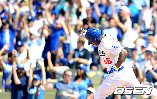 6회말 2사 1,3루에서 다저스 푸이그가 스리런포를 날리고 그라운드를 돌고 있다.