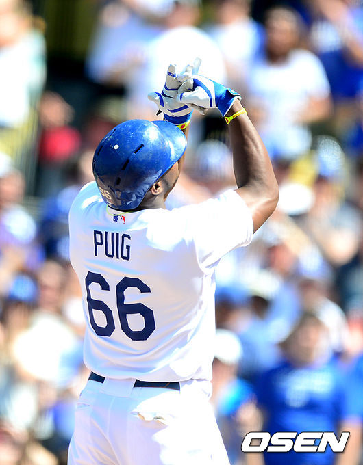 6회말 2사 1,3루에서 다저스 푸이그가 스리런포를 날리고 홈을 밟으며 세레모니를 하고 있다.