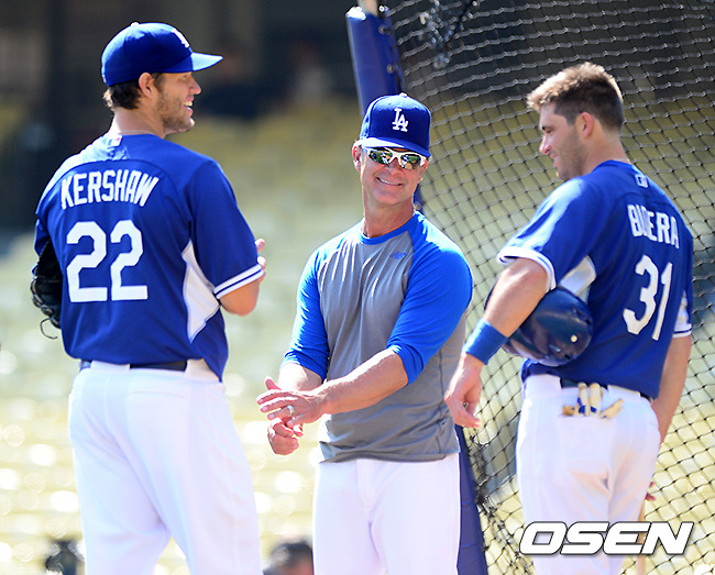 경기에 앞서 다저스 커쇼가 시뮬레이션 피칭을 마치고 매팅리 감독과 이야기를 나누고 있다. /jpnews@osen.co.kr