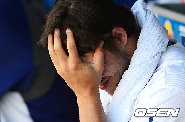 다저스 커쇼가 더그아웃에서 경기를 지켜보며 손으로 얼굴을 비비고 있다. /jpnews@osen.co.kr