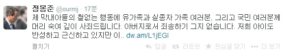 정몽준 의원은 또 "이번 일로 마음의 상처를 입으신 유가족과 실종자 가족, 그리고 국민 여러분께 다시 한 번 진심으로 사죄드린다"고 강조했다.