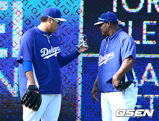 경기에 앞서 다저스 류현진이 유리베와 새로 나온 버블헤드를 바라보고 있다.