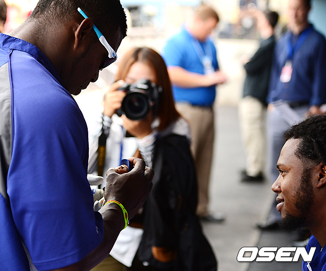 경기에 앞서 다저스 푸이그와 라미레스가 류현진의 버블헤드를 바라보고 있다.