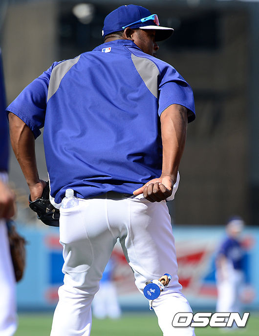 경기에 앞서 다저스 유리베가 류현진의 버블헤드를 뒷 주머니에 넣고 수비훈련을 하다 떨어 뜨리고 있다.