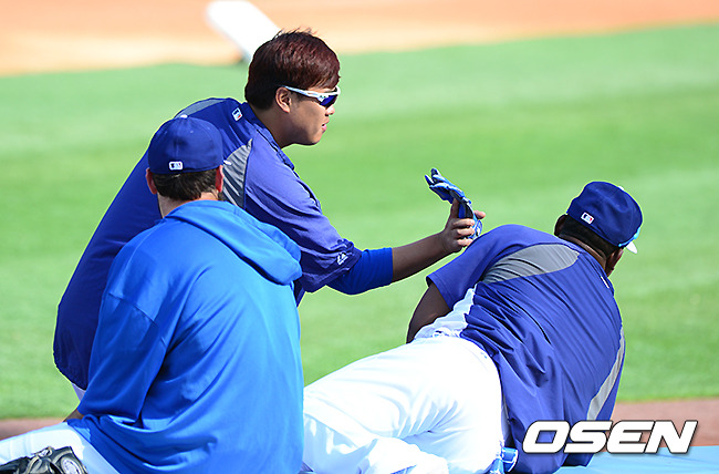 경기에 앞서 다저스 류현진이 훈련을 하며 유리베에 장난을 치고 있다.