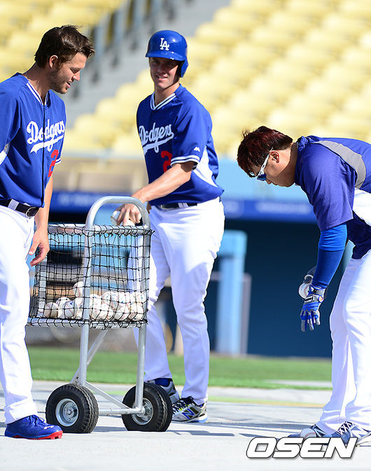 경기에 앞서 다저스 커쇼, 그레인키, 류현진이 타격 훈련을 마치고 볼을 정리하고 있다.