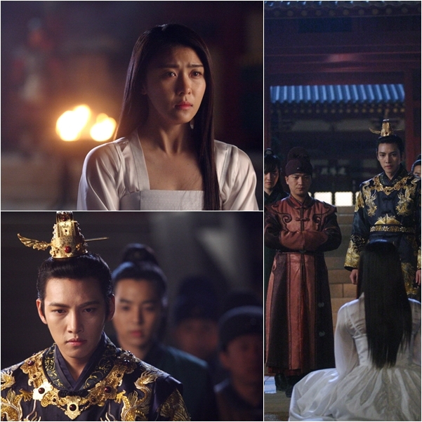 이날 오전 MBC 측이 공개한 사진 속 기승냥은 얇은 소복차림으로 대전 앞에 앉아 있고, 타환은 그런 승냥을 차가운 눈빛으로 바라보고 있다.