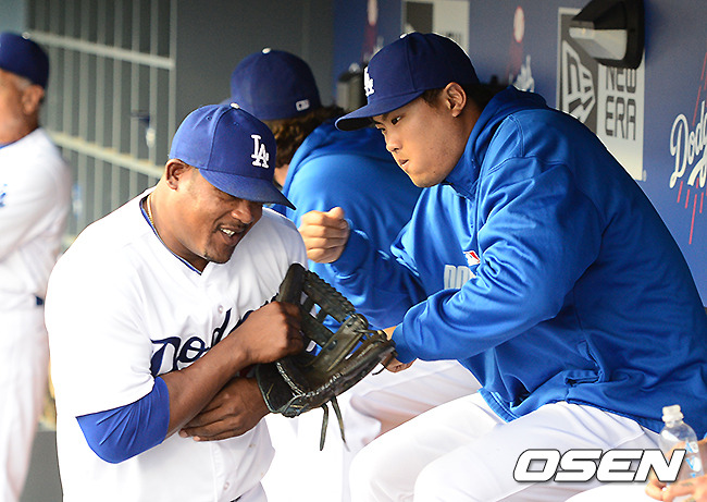 경기에 앞서 다저스 유리베와 류현진이 장난을 치고 있다.