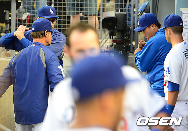 경기에 앞서 다저스 류현진이 매팅리 감독과 타격 자세에 대해 이야기 나누고 있다.