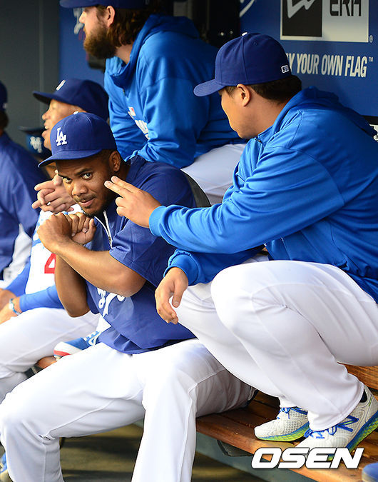 경기에 앞서 다저스 류현진이 잰슨과 장난을 치고 있다.