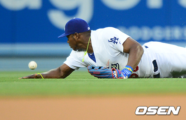 1회초 무사 1루에서 다저스 푸이그가 필라델피아 롤린스의 타구를 놓치고 있다.