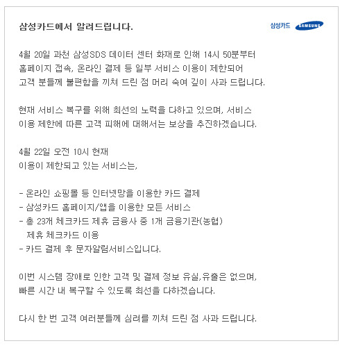 삼성카드는 앞서 지난 20일 발생한 과천 삼성SDS 데이터 센터 화재로 인해 20일 오후 2시50분부터 홈페이지 접속과 온라인 결제 등 일부 서비스 이용이 제한됐다고 공지했다.