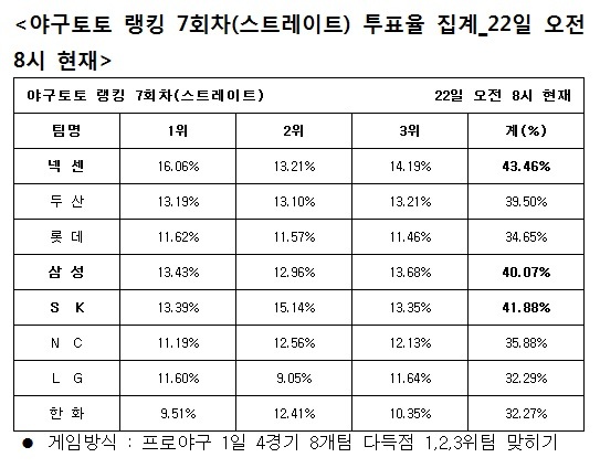 국민체육진흥공단(www.kspo.or.kr)이 발행하는 체육진흥투표권 수탁사업자인 스포츠토토 공식발매사이트인 베트맨(www.betman.co.kr)은 오는 23일에 열리는 넥센-롯데, SK-NC, 한화-두산, 삼성-LG 등 4경기 8개팀을 대상으로 한 야구토토 랭킹 7회차 스트레이트 게임 중간집계결과 넥센(43.46%) SK(41.88%), 삼성(40.07%)를 차례로 다득점 상위 3개팀으로 꼽았다고 밝혔다. 반면 LG와 한화는 각각 32.29%와 32.27%를 득표해 가장 적은 득점을 기록할 것으로 예상했다.