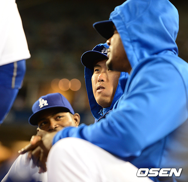 다저스 푸이그, 류현진, 유리베가 더그아웃에 나란히 앉아 경기를 지켜보고 있다.