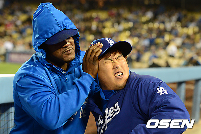 경기 도중 한국 팬들이 관중석에서 류현진을 외치자 유리베가 류현진의 목을 돌려 팬들에 얼굴을 내보이고 있다.