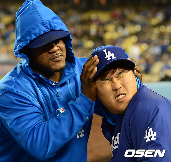 경기 도중 한국 팬들이 관중석에서 류현진을 외치자 유리베가 류현진의 목을 돌려 팬들에 얼굴을 내보이고 있다.