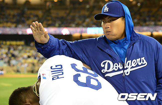 다저스 류현진이 푸이그와 경기 도중 장난을 치고 있다.