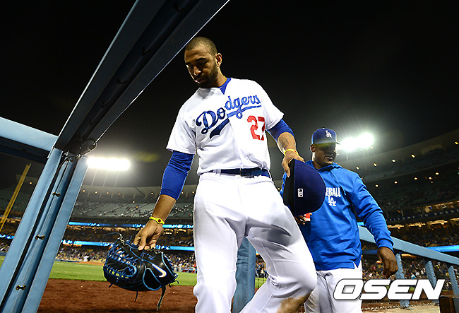 다저스 맷 켐프가 7회초 수비를 마치고 더그아웃에 들어서고 있다.