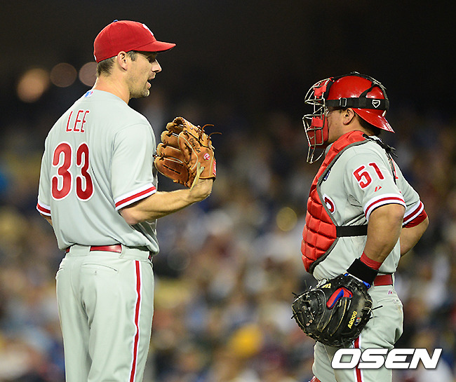 경기 도중 필라델피아 선발 클리프 리가 루이스와 이야기를 나누고 있다.