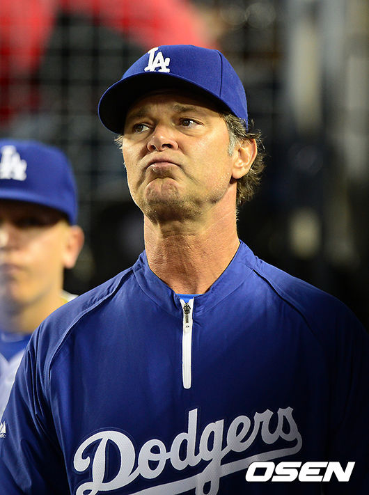 다저스 매팅리 감독이 경기가 잘 안풀리자 더그아웃에서 생각에 잠겨 있다.