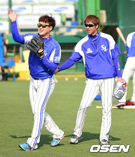 경기에 앞서 수비 훈련을 하던 삼성 임창용이 안지만에게 장난을 치고 있다.