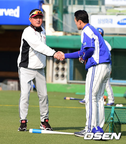 경기에 앞서 LG 김기태 감독이 삼성 이승엽과 인사를 나누고 있다.