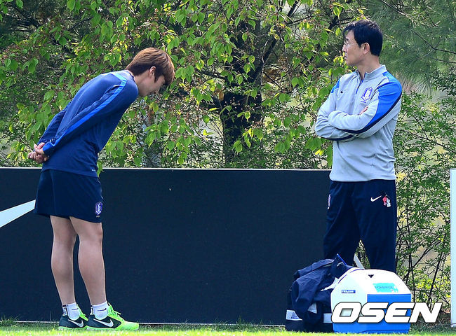여자 축구대표팀 박은선이 22일 오후 파주 NFC(국가대표 트레이닝센터)에서 윤덕여 감독과 이야기를 나누고 인사를 하고 있다.
