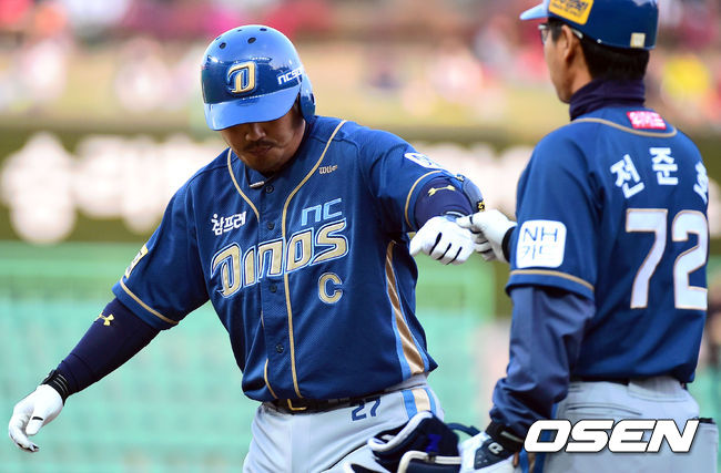 1회초 2사 1루 우익수 앞 안타를 날린 NC 이호준이 전준호 코치와 하이파이브를 하고 있다.