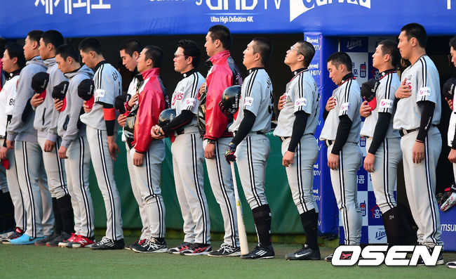 경기에 앞서 LG 선수들이 국민 의례를 갖고 있다.