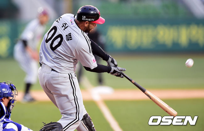 1회초 2사 1,3루에서 LG 벨이 희생플라이를 날리고 있다.
