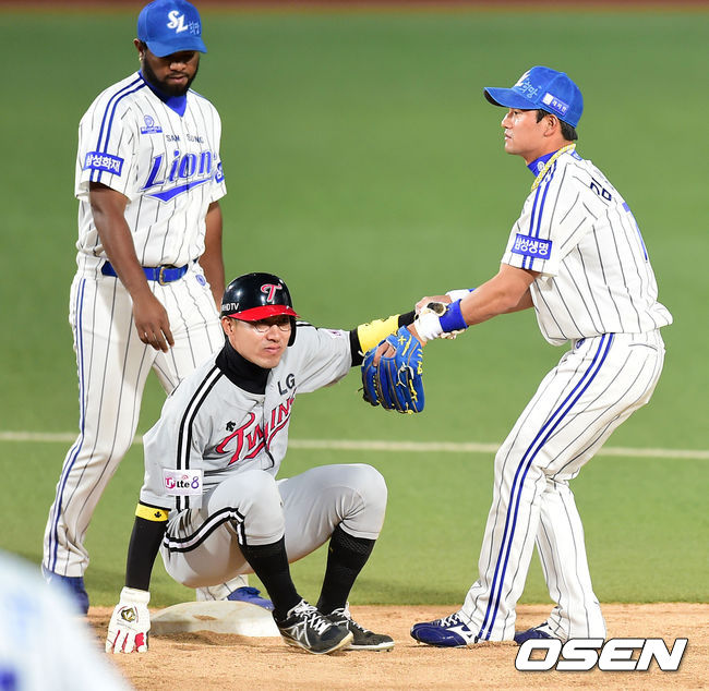 4회초 1사 1루 삼성 김상수가 LG 이병규의 내야땅볼 때 포스아웃된 1루주자 정성훈을 일으켜주고 있다.