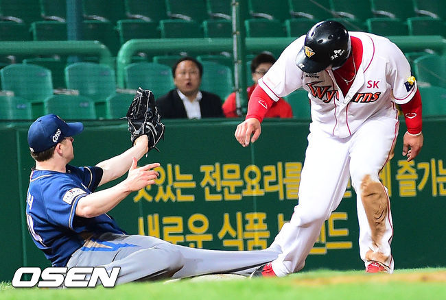 4회초 1사 주자 2루 SK 김강민의 3루수 땅볼타구때 1루에서 김강민이 포스아웃을 당한 후 SK 정상호가 3루에서 NC 선발 에릭에게 태그아웃을 당하고 있다.