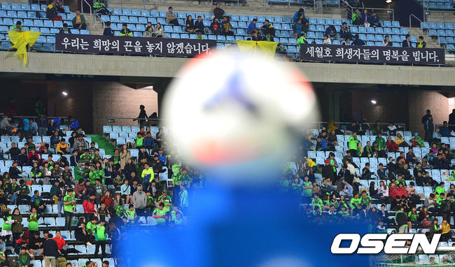 경기 시작을 앞두고 전북 현대 서포터들의 세월호 침몰 실종자와 희생자를 추모하는 피켓이 걸려있다.