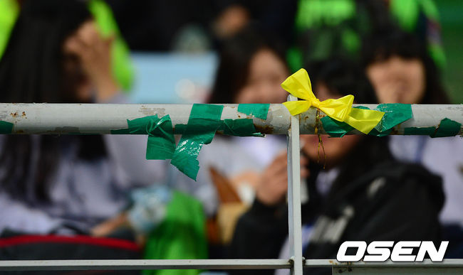 전북 서포터들이 경기장 난간에 세월호 실종자와 희생자를 애도하는 노란리본을 메달고 경기를 관람하고 있다.