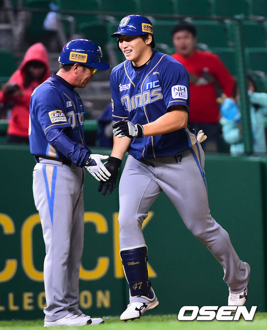 7회초 2사 1,3루 우익수 뒤 역전 스리런 홈런을 날린 NC 나성범이 웃으며 코치와 하이파이브를 나누고 있다.