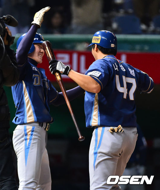 7회초 2사 1,3루 우익수 뒤 역전 스리런 홈런으로 홈을 밟은 NC 나성범이 박민우와 하이파이브를 나누고 있다.