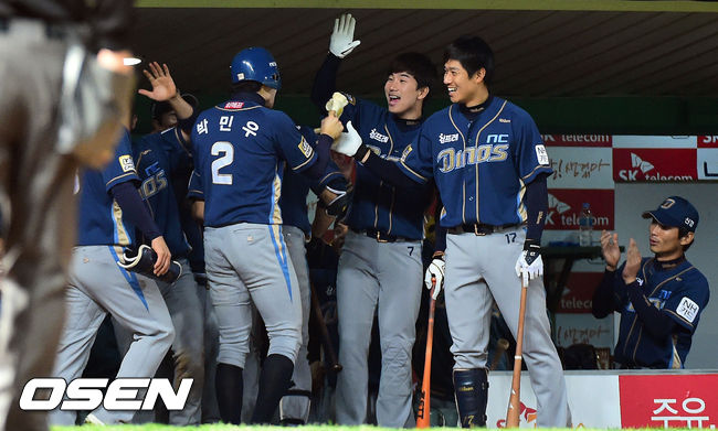 7회초 2사 1,3루 우익수 뒤 역전 스리런 홈런을 날린 NC 나성범과 박민우가 덕아웃에서 동료들의 환호를 받고 있다.