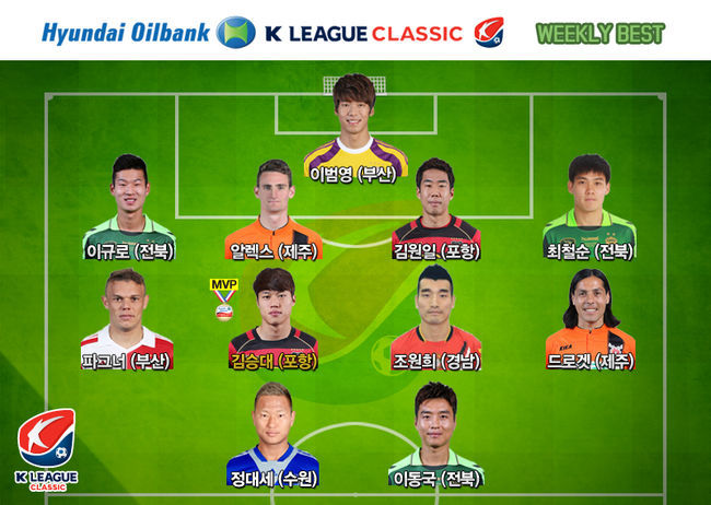 베스트 11 공격수에는 2경기 연속골을 넣은 이동국(전북)과 정대세(수원)가 뽑혔고, 미드필더에는 김승대를 비롯해 드로겟(제주), 조원희(경남), 파그너(부산)가 선정됐다. 수비라인은 최철순과 이규로(이상 전북), 김원일(포항), 알렉스(제주)로 구성됐다. 골키퍼는 눈부신 선방을 펼치며 실점을 허용하지 않은 이범영(부산)이 됐다.