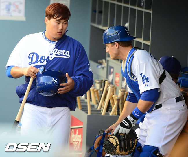 1회초 삼자범퇴로 막아낸 다저스 선발 류현진이 팀 페데로위츠에게 말을 걸고 있다.