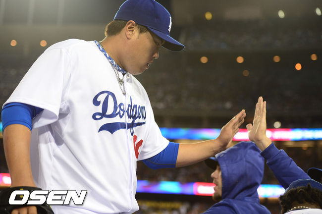 4회를 마친 LA 다저스 류현진이 덕아웃으로 들어오며 동료들과 하이파이브를 하고 있다.