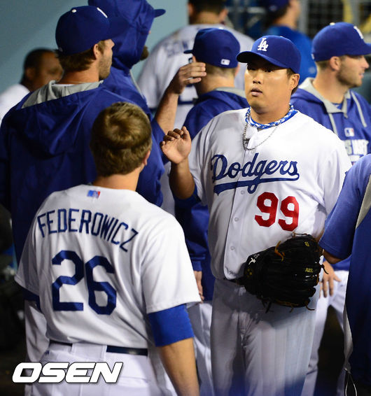 3회를 마친 다저스 선발 류현진이 클레이튼 커쇼와 하이파이브를 하고 있다.